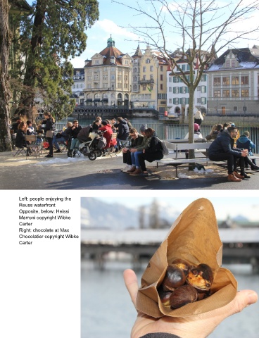 Left: people enjoying the Reuss waterfront Opposite, below: Heissi Marroni copyright Wibke Carter Right: chocolate at Max Chocolatier copyright Wibke Carter