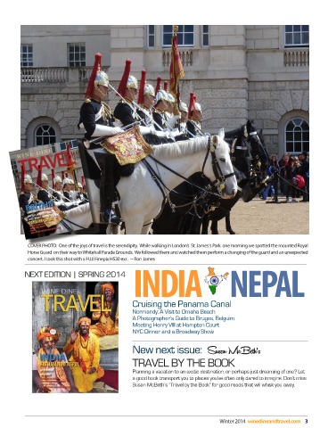 COVER PHOTO: One of the joys of travel is the serendipity. While walking in London’s St. James ‘s Park one morning we spotted the mounted Royal