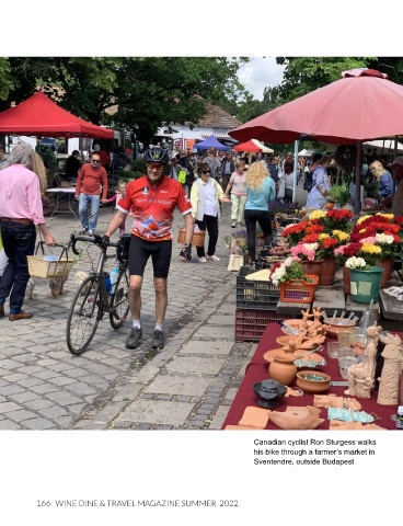 Canadian cyclist Ron Sturgess walks his bike through a farmer’s market in Sventendre, outside Budapest 166 WINE DINE & TRAVEL MAGAZINE SUMMER 2022