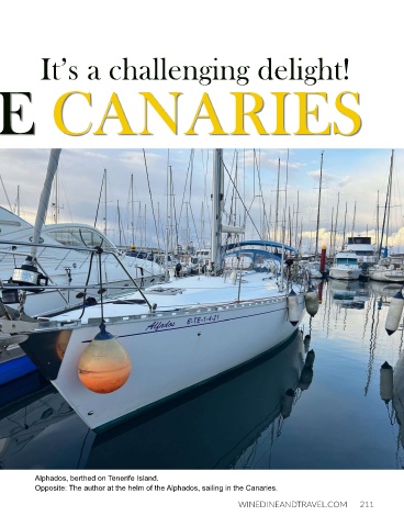 It’s a challenging delight! SAILING THE CANARIES Alphados, berthed on Tenerife Island. Opposite: The author at the helm of the Alphados, sailing in the Canaries. WINEDINEANDTRAVEL.COM 211