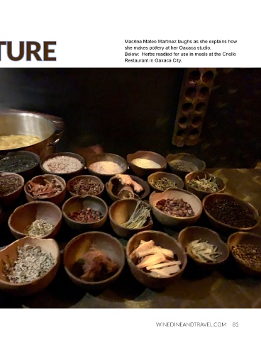 Macrina Mateo Martinez laughs as she explains how she makes pottery at her Oaxaca studio. Below: Herbs readied for use in meals at the Criollo Restaurant in Oaxaca City. WINEDINEANDTRAVEL.COM 83