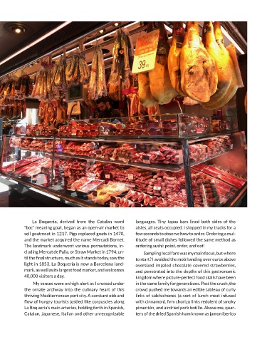 La Boqueria, derived from the Catalan word languages. Tiny tapas bars lined both sides of the