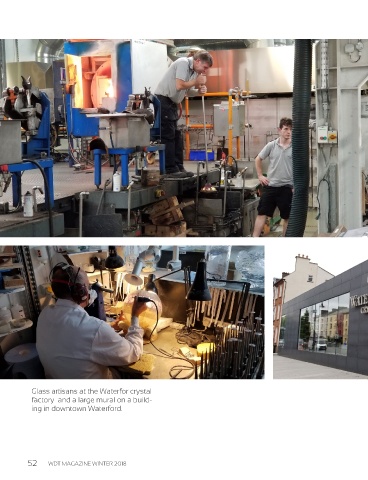 Glass artisans at the Waterfor crystal factory and a large mural on a build- ing in downtown Waterford. 52 WDT MAGAZINE WINTER 2018
