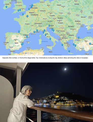 Opposite: Ron & Mary in front of the Haga Sofia, Top: Destinations during the trip. Bottom: Mary admiring the view in Kusadasi WINEDINEANDTRAVEL.COM 23